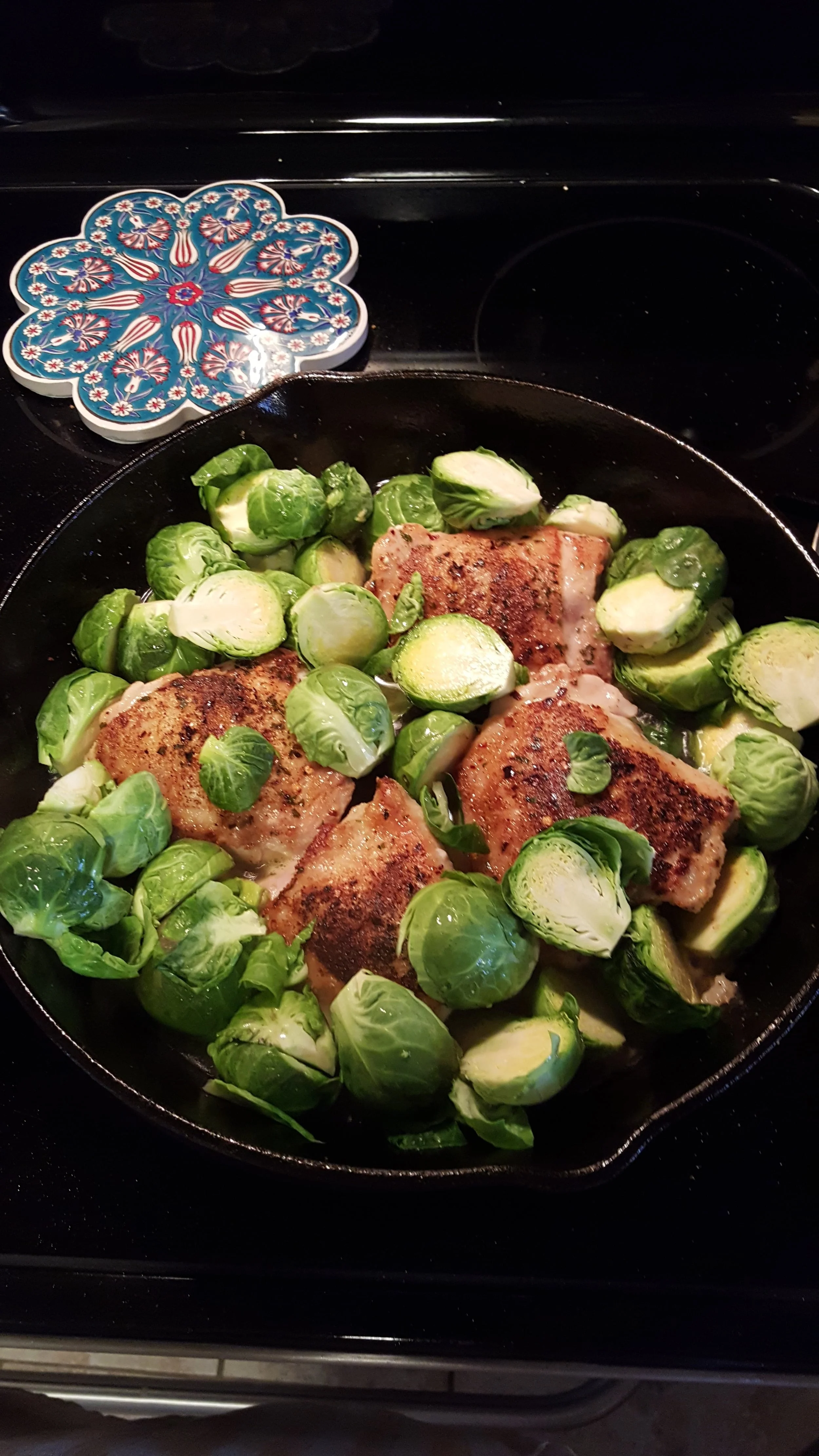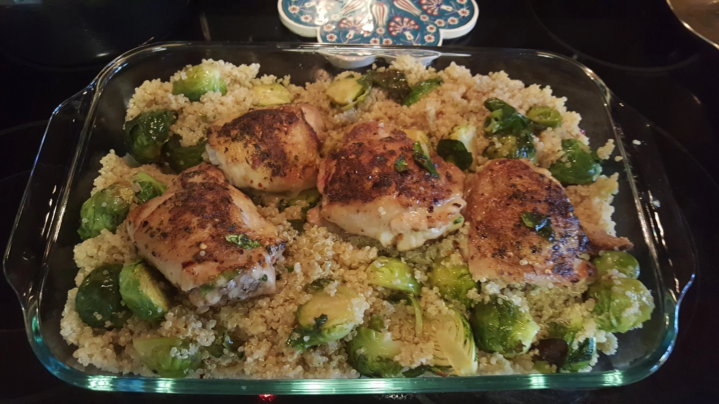 While cooking, cook 1 cup of quinoa with 2 cups of chicken broth. Add quinoa to a serving dish. Remove chicken thighs from skillet (careful...skillet is hot...) and mix broth and brussel sprouts into quinoa in dish. Top with chicken thighs.