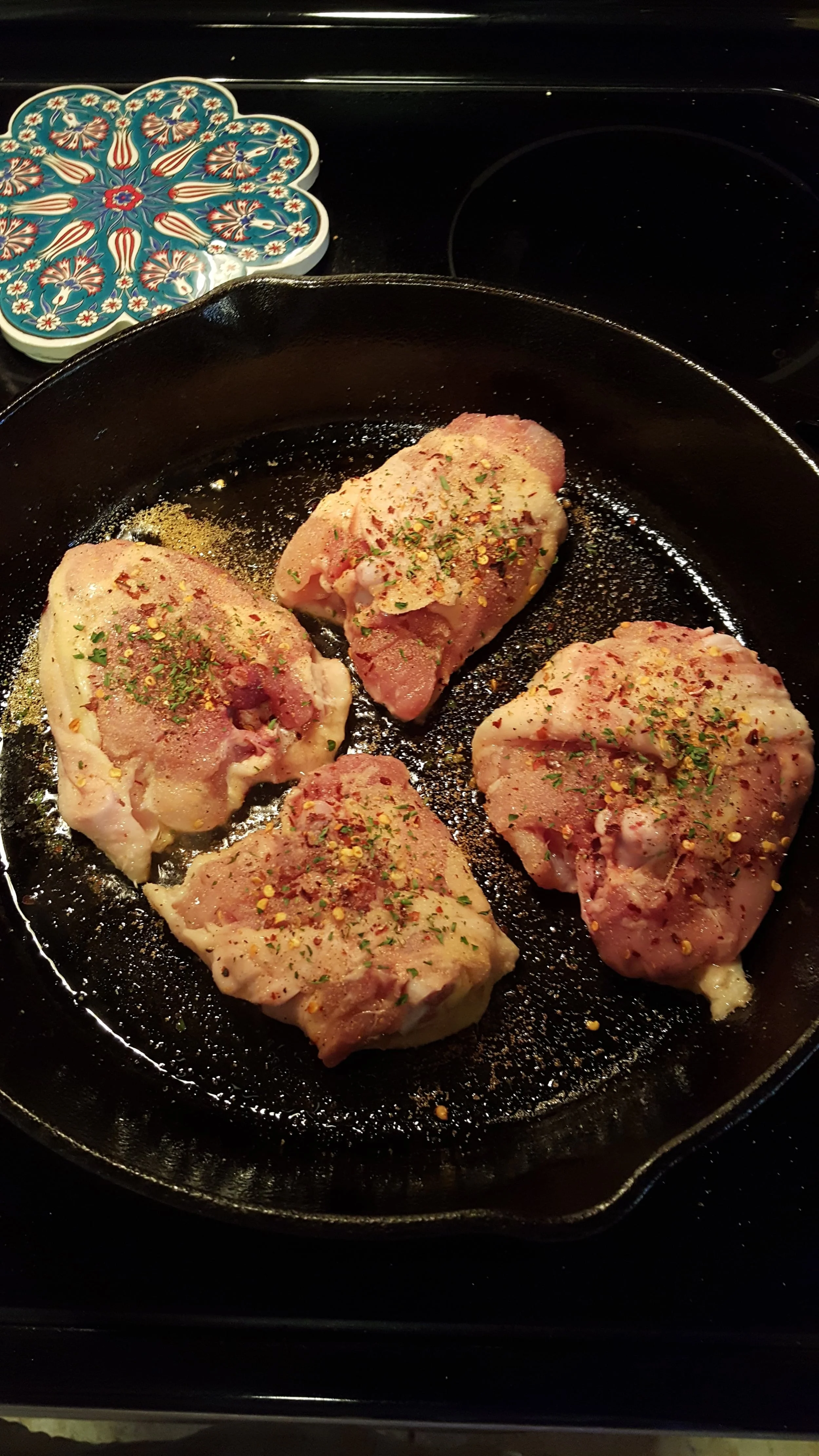 This has become a favorite meal in our house. It's quick, easy and ridiculously flavorful. In a heated cast iron skillet, sear seasoned chicken thighs, skin side down, for three minutes.